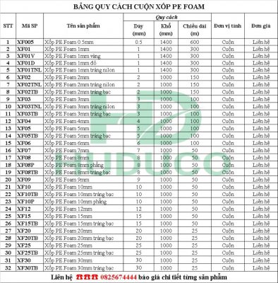 Bảng quy cách cuộn xốp PE Foam tại HUDUCO